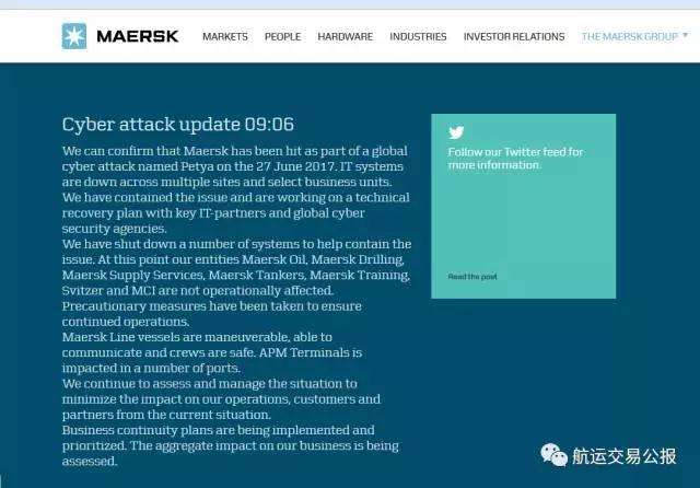 “我们可以确认,2017年6月27日,名为Petya的网络病毒袭击全球,A.P.穆勒—马士基在全球多处办事机构及部分业务单元的IT系统因此出现故障。