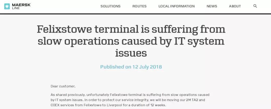 据搜航网最新获悉,英国最大的集装箱港口费利克斯托(Felixstowe)港最近因码头操作系统(TOS)的升级过程出现状况,导致码头作业非常缓慢,效率低下,目前已经造成港口货物严重积压,大量集装箱船及货物严重延误!