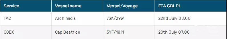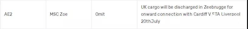 英国的货物将于7月20日在Zeebrugge卸货,并与 Cardiff V ETA Liverpool 进行联运: