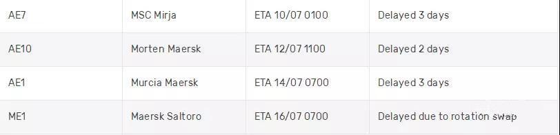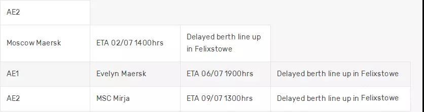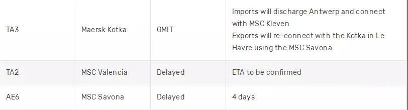 以下是部分已经延误,或者计划跳港,改港的航线及航次。因为此次事发欧洲航线上最为重要的港口Felixstowe,基本各大船公司的欧洲线都直接或间接受到影响。
