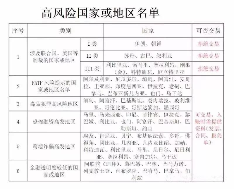 包括伊朗、苏丹、朝鲜、叙利亚、古巴,这5个国家是受联合国和/或美国制裁的,国内大部分银行拒绝办理这些国家的任何国际业务。
