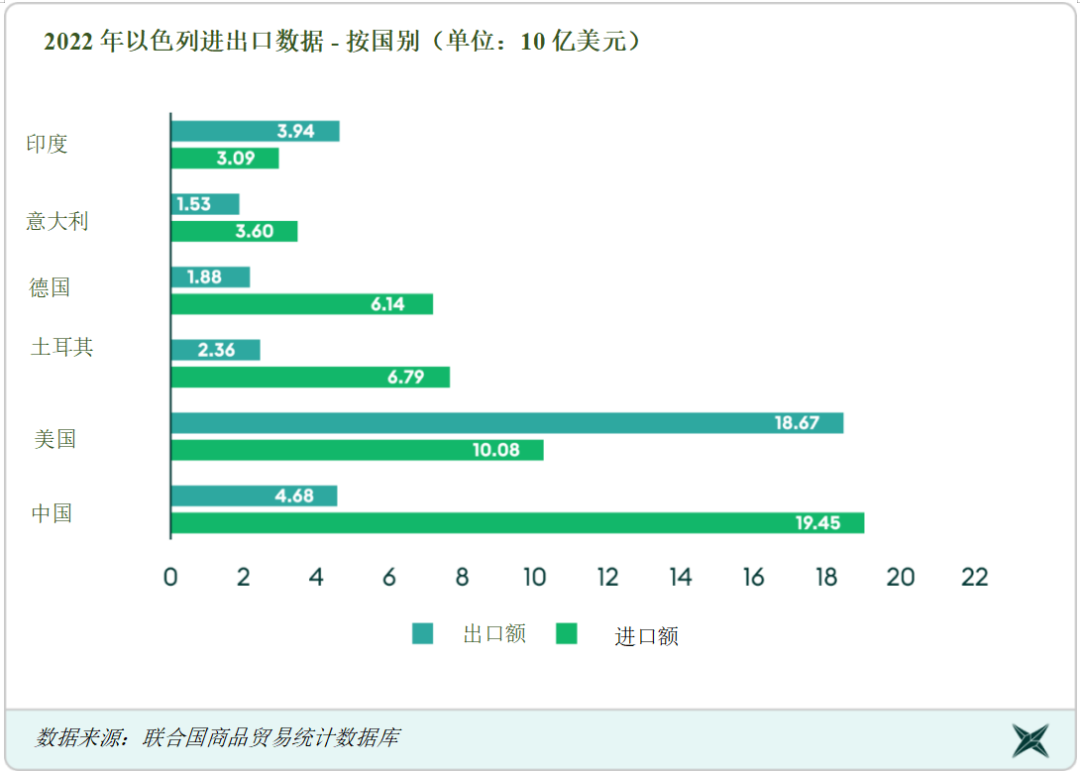 德国是以色列在欧洲的重要贸易伙伴。以色列对德国的出口额达到18.8亿美元。然而,由于以色列地区局势的不稳定,本轮冲突可能会影响以色列对德国的出口,使德国从以色列的进口受到影响。