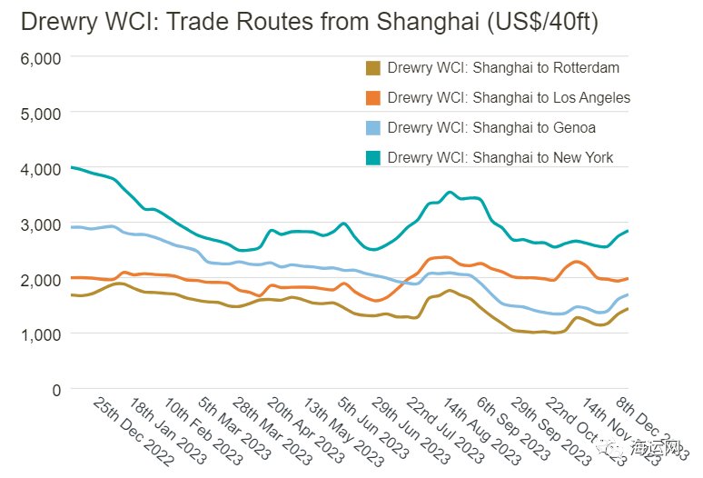 需要注意的是,包括马士基、达飞、赫伯罗特等多家船公司在2024年1月1日再次宣布将大幅提高亚洲至北欧和地中海航线的FAK费率。涨幅预计在12月15日公布的SCFI运价指数的20-50%之间。