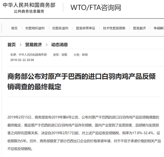 对原产于巴西的进口白羽肉鸡产品征收反倾销税和价格承诺的实施期限已于昨日到期
