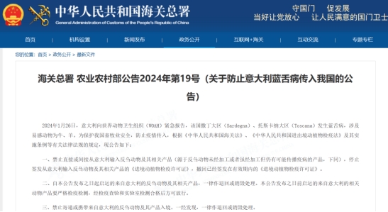 海关总署 农业农村部公告2024年第19号(关于防止意大利蓝舌病传入我国的公告)