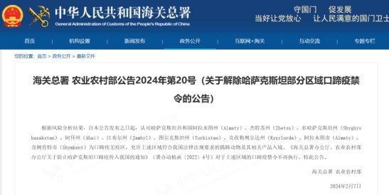 (关于解除哈萨克斯坦部分区域口蹄疫禁令的公告)