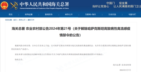 (关于解除哈萨克斯坦高致病性禽流感疫情禁令的公告)