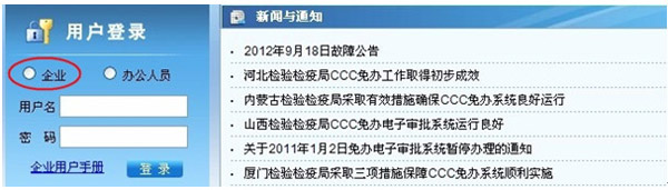 1、访问国家认监委CCC免办电子审批系统主页http://mb.cnca.cn/CCCmianban,选择“企业”,输入用户名和密码,点击“登陆”。