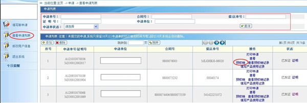2、登陆后,点击“查看申请列表”,出现申请单信息。找到需预核销的单证,在“操作”栏点击“预核销”,进入填写页面。如申请单较多,可以在上方查询栏输入查询条件,以便快速找到相应单证。