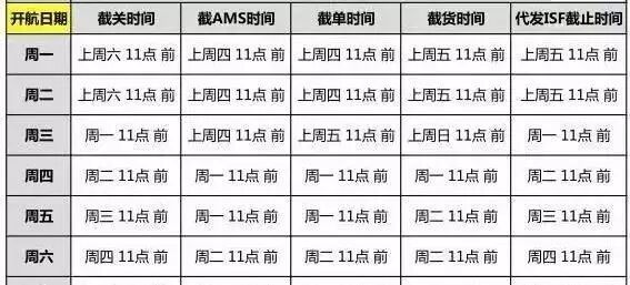 如:截AMS时间(美国)、截ACI时间(加拿大)、截ENS时间(欧盟)、截单时间、截货时间、代发ISF截止时间等。
