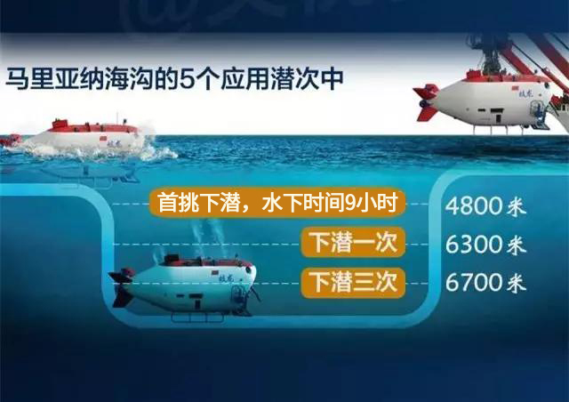 在随后进行的马里亚纳海沟4个应用潜次中,设计潜深一个是6300米,其他3个为6700米。