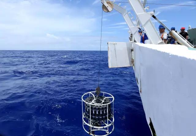 5月22日,中国大洋38航次科考队抵达马里亚纳海沟作业区,科考队员用温盐深仪(CTD)进行海水温度、盐度、深度等调查,为23日“蛟龙”号本航段第一潜提供相关数据。