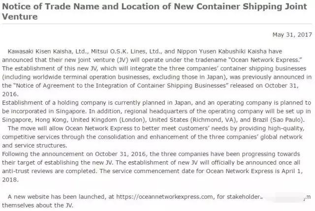 刚刚自其他媒体出得知,日本三大航运巨头:MOL、Kline、NYK公布了其整合后合资公司的名称:Ocean Network Express!